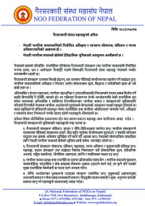 गैरसरकारी संस्था महासंघ नेपालले देशको परिवर्तित राजनीतिक परिवेशमा गैरसरकारी संस्था(एनजीओ) र नागरिक समाजहरुमाथि नियोजित रुपमा हल्ला, भ्रम र आरोपहरु फैलाईदै गएको विषयमा गम्भीर ध्यानाकर्षण जनाएको छ ।